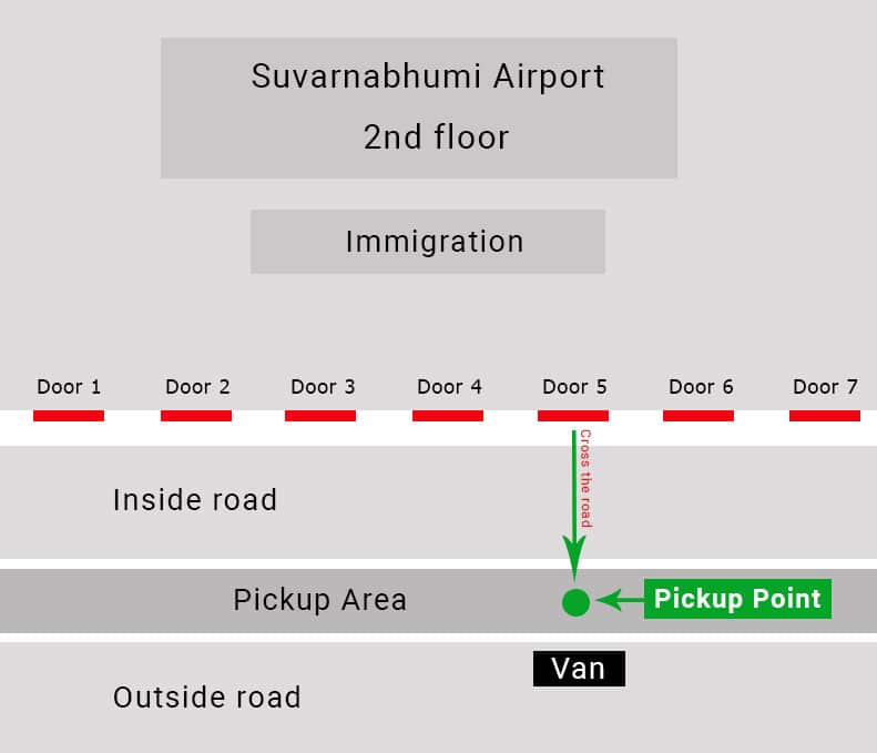 Walk out of the airport pass immigration to Door No. 5, cross inside road and wait at the pick-up point (Green Spot).